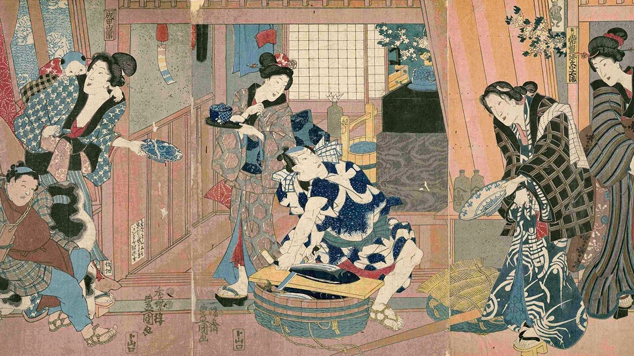 标题图片:歌川丰国(第3代)的作品《卯之花月》。图中描绘了“里长屋”的妇女们围着鱼贩争相购买,鱼贩当场杀鱼出售的场景。这幅浮世绘生动再现了当时“长屋”的生活场景(现藏于东京都立中央图书馆特别文库室)