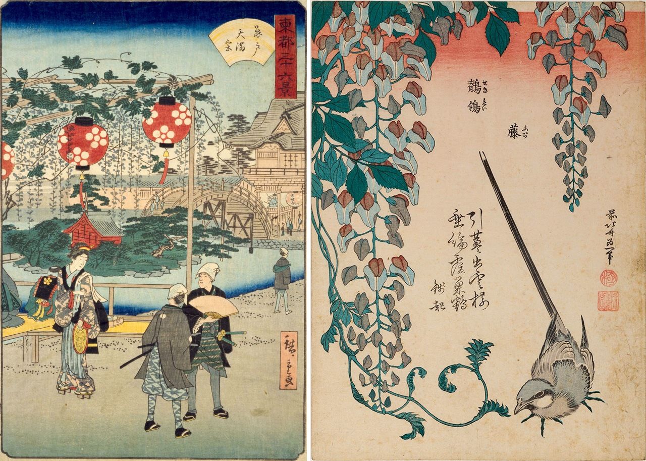 (左)歌川广重的画作《东都三十六景》,描绘了龟户天满宫和藤架(现藏于国立国会图书馆)/(右)葛饰北斋的《藤花与鹡鸰》,是雀形目鸟类(图片:colbase)
