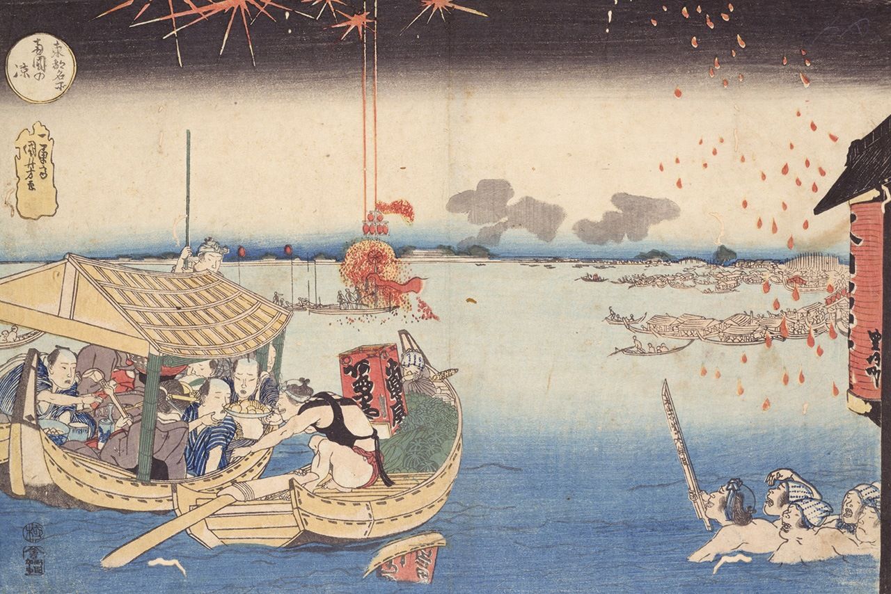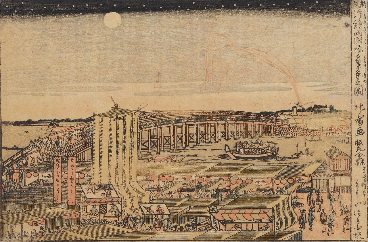 《新板浮绘两国桥夕景色之图》的画面近处是移动摊位和地摊,远处则是隅田川和烟花(图片:colbase)