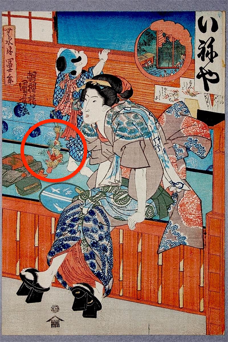 孩子脚边(红圈部分)便是麦秆蛇(出自《无水月富士参》,现藏于足立区立乡土博物馆)