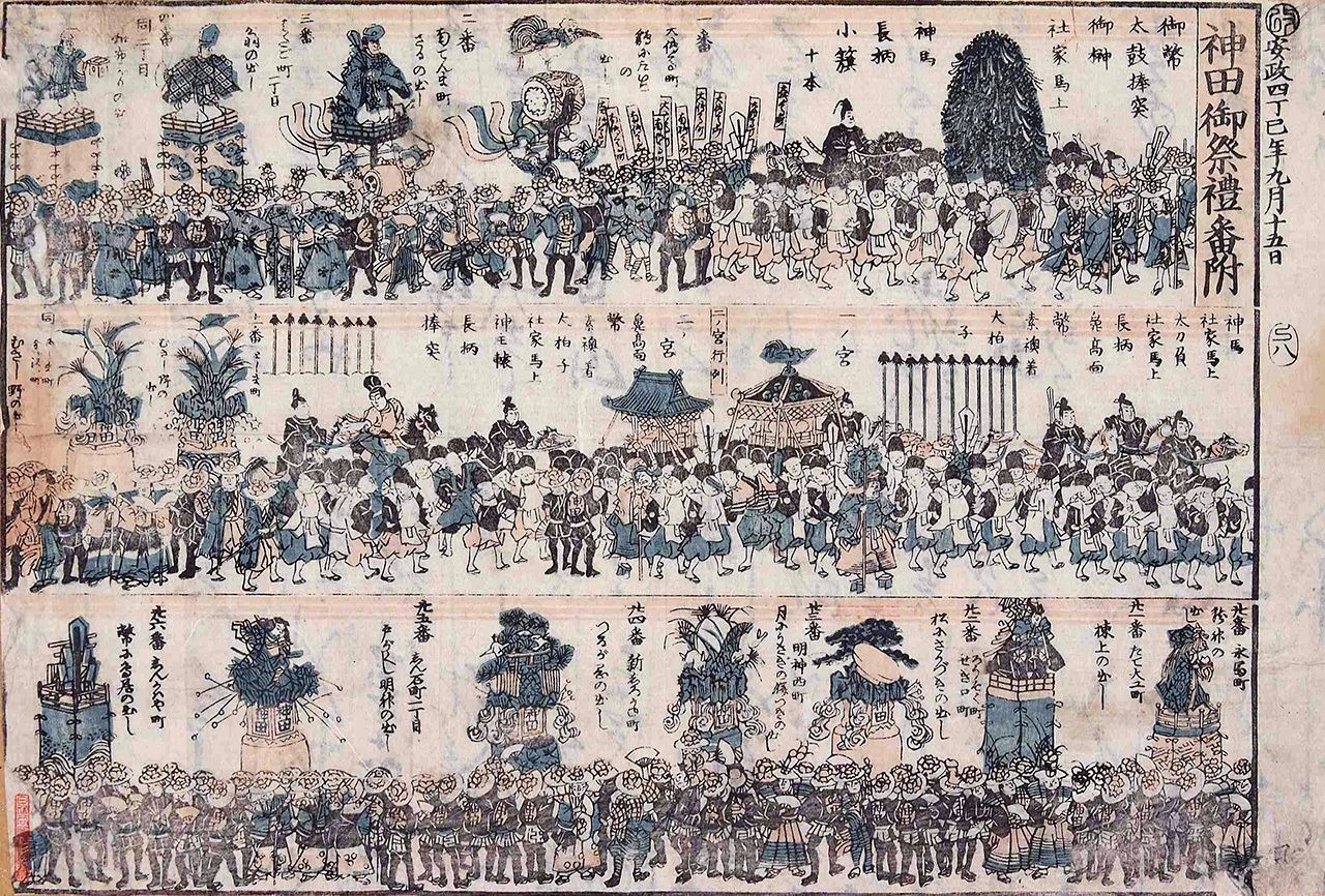 神田神社天王祭的游行队伍。图中描绘了花车与神轿巡游的景象(出自《神田御祭礼番附》,现藏于东京都立中央图书馆特别文库室)