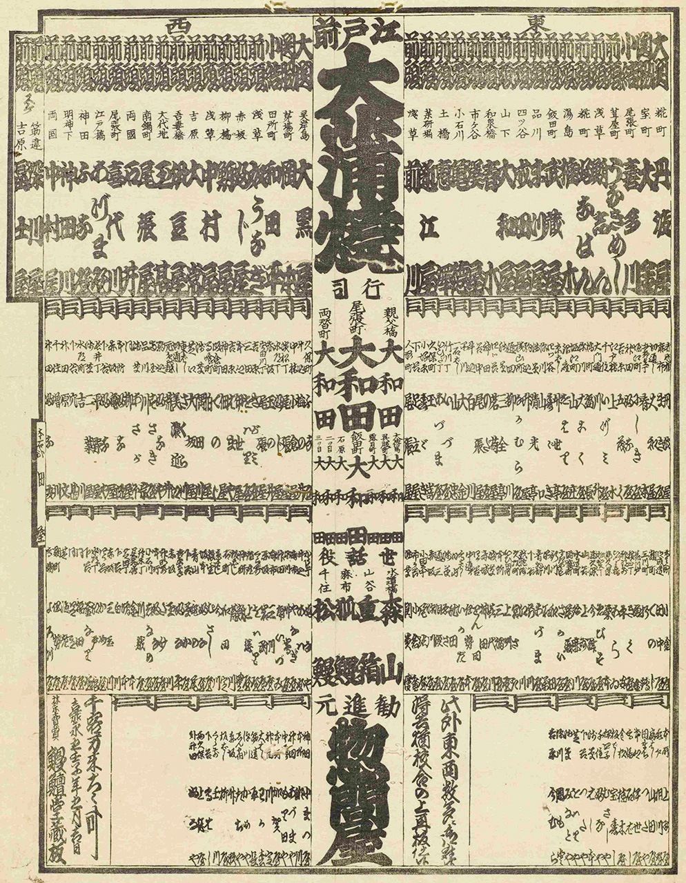 《江户前大蒲烧一览表》是嘉永5年对江户鳗鱼店进行排名的榜单,其中最高等级为“大关”(现藏于东京都立中央图书馆特别文库室)
