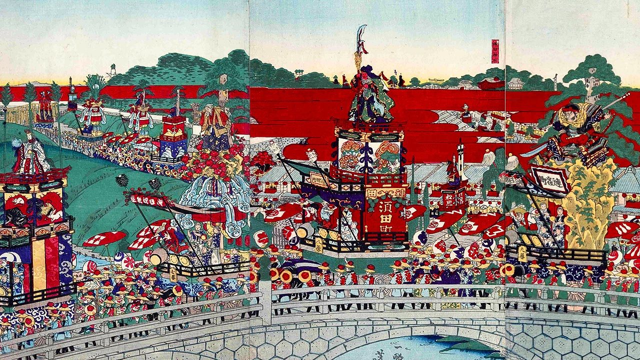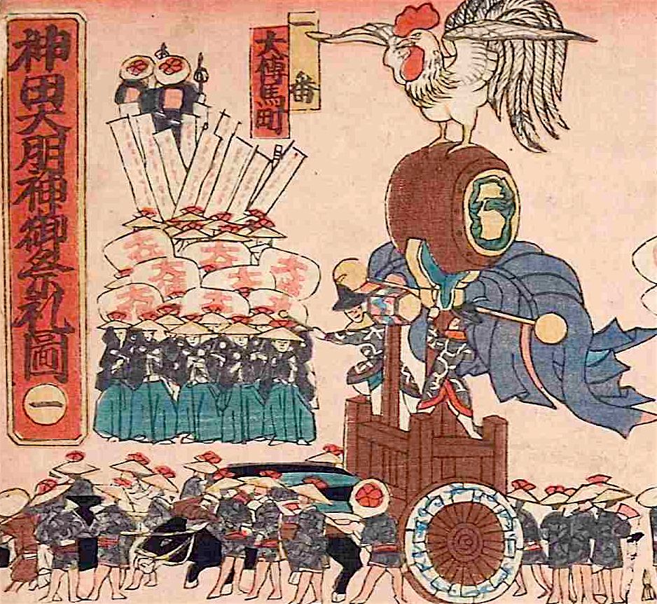 标题图片:《东京神田神社祭礼之图》,左起分别为六号(通新石町)、七号(须田町一丁目)、八号(须田町二丁目)、九号(连雀町)彩车。其中八号彩车顶部的人偶原型为关羽,被誉为杰作(东京都立中央图书馆特别文库室藏)