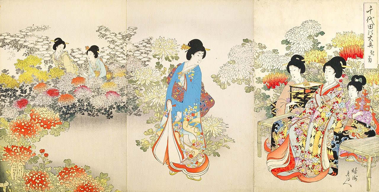 《千代田的大奥 赏菊》描绘了江户城大奥的御台所与女官们赏菊的场景。杨洲周延绘(日本国立国会图书馆藏)