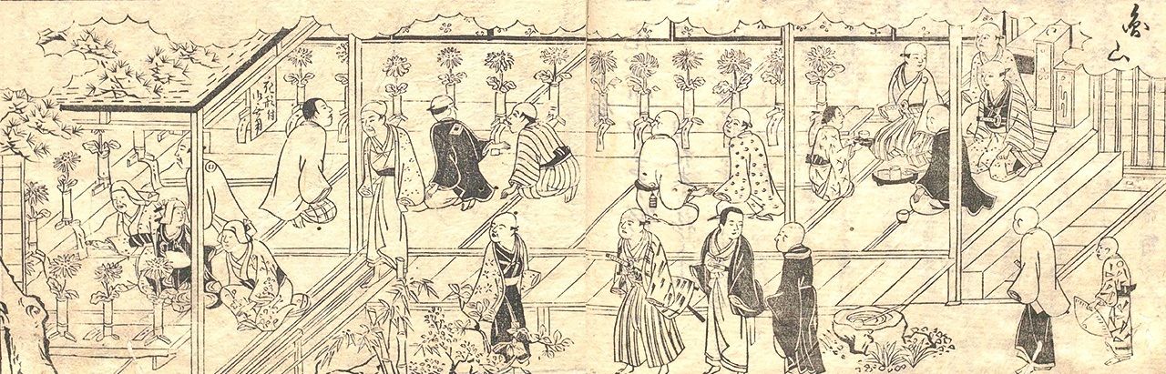 《花坛养菊集》是一本菊花种植手册,插图描绘了人们品评菊花的场景(国文学研究资料馆藏)