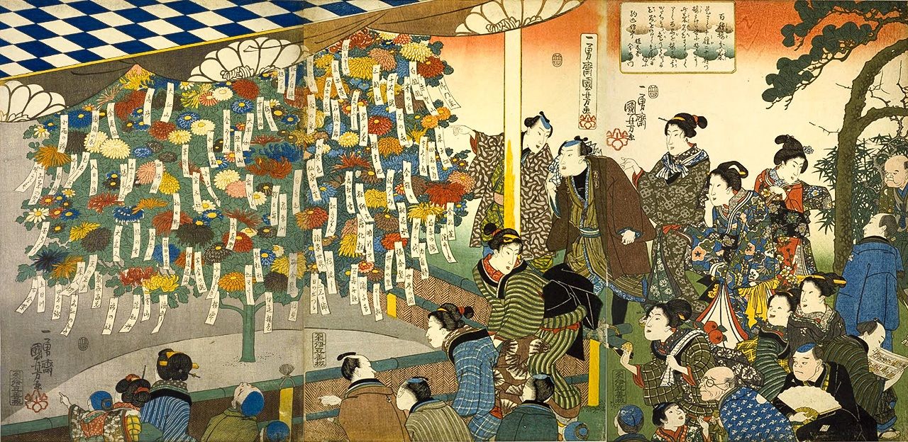 进入文化年间(1804-1818年),用菊花装饰船只模型或人偶的花卉艺术也日渐盛行。弘化年间(1845-1848年),东京驹込地区的园艺师今右卫门创作出一件将多种菊花嫁接于同一植株上的精巧作品,引发人们关注。