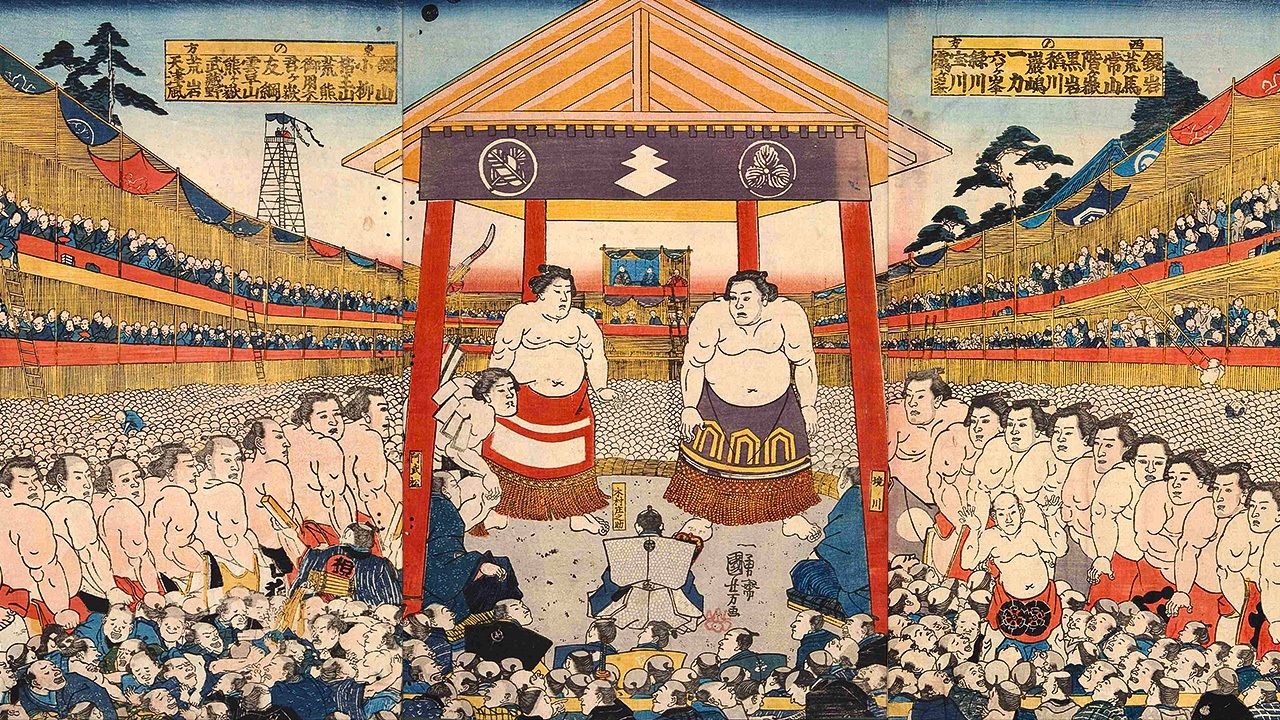 标题图片:《劝进大相扑土俵入之图》描绘了1849年于回向院举行的相扑赛事中力士们亮相仪式的场景(东京都立中央图书馆特别文库室藏)