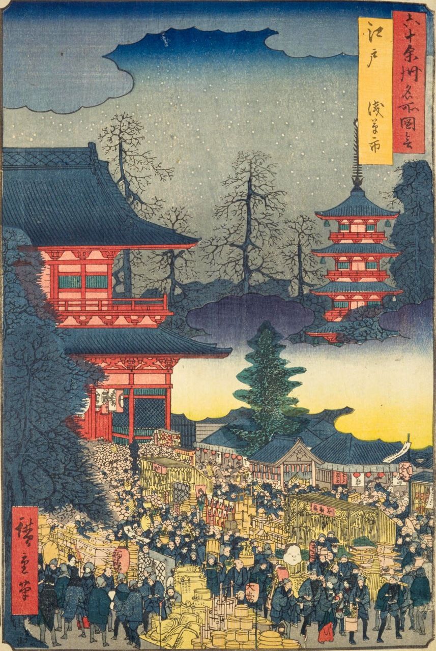 《六十余州名所图会 江户 浅草市》描绘了浅草寺岁之市的热闹景象(国立国会图书馆藏)