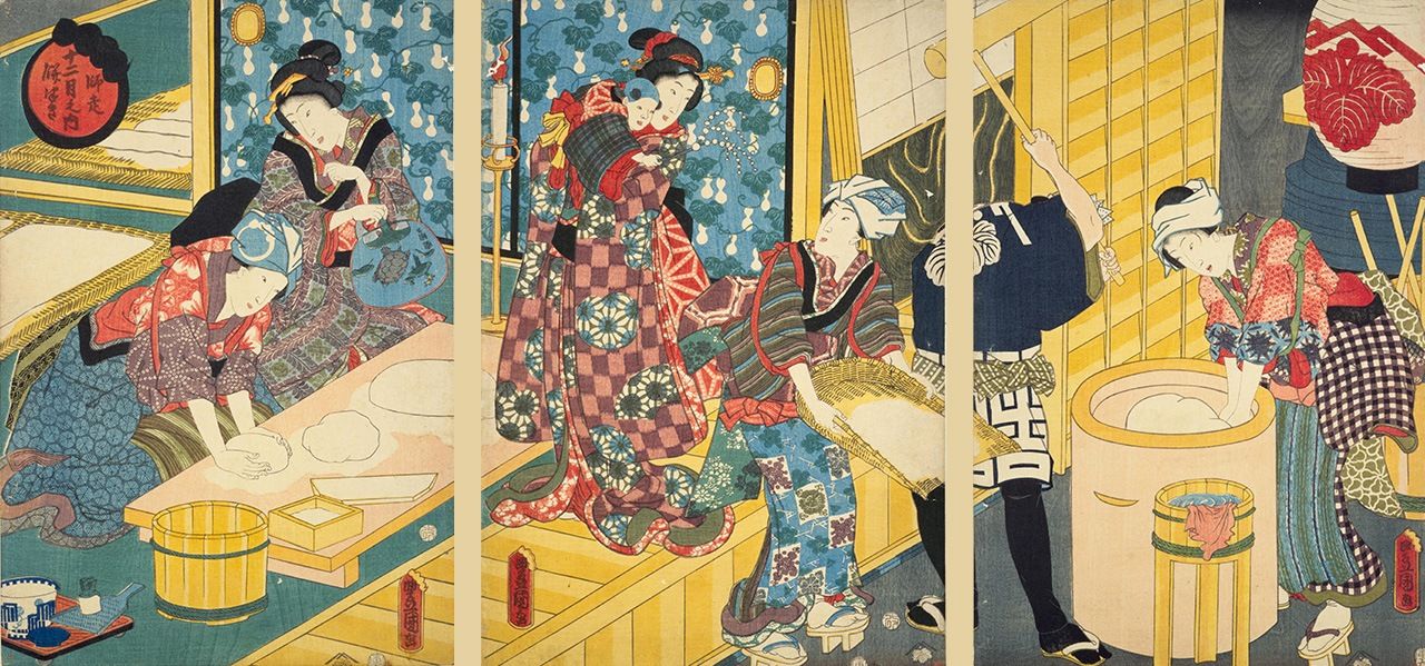 标题图片:(左起)喜多川歌麿绘《武家扫灰图》(出自Colbase);制作镜饼的女子们(出自《意势固世身见立十二直 极月之捣年糕》,东京都立中央图书馆特别文库室藏);浅草寺年末集市的景象(出自《江户自慢三十六兴 浅草年之市》,国立国会图书馆藏)