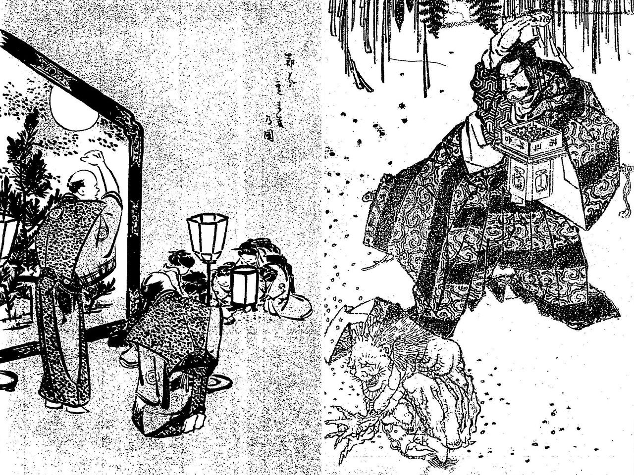 (左)当年为本命年的男子身穿武士礼服负责撒豆(出自《绘本风俗往来》);(右)《北斋漫画》中,因打退酒吞童子等鬼怪而闻名的坂田金时(金太郎)把豆子扔向鬼,将鬼逐走(均藏于国立国会图书馆)