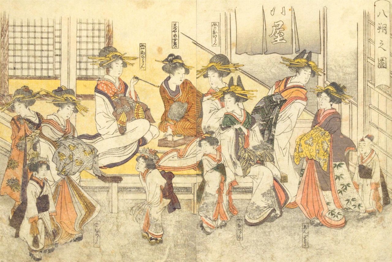 标题图片:《东都名所一览 新吉原八朔》描绘了游女们在八朔这一天的姿态(国立国会图书馆藏)