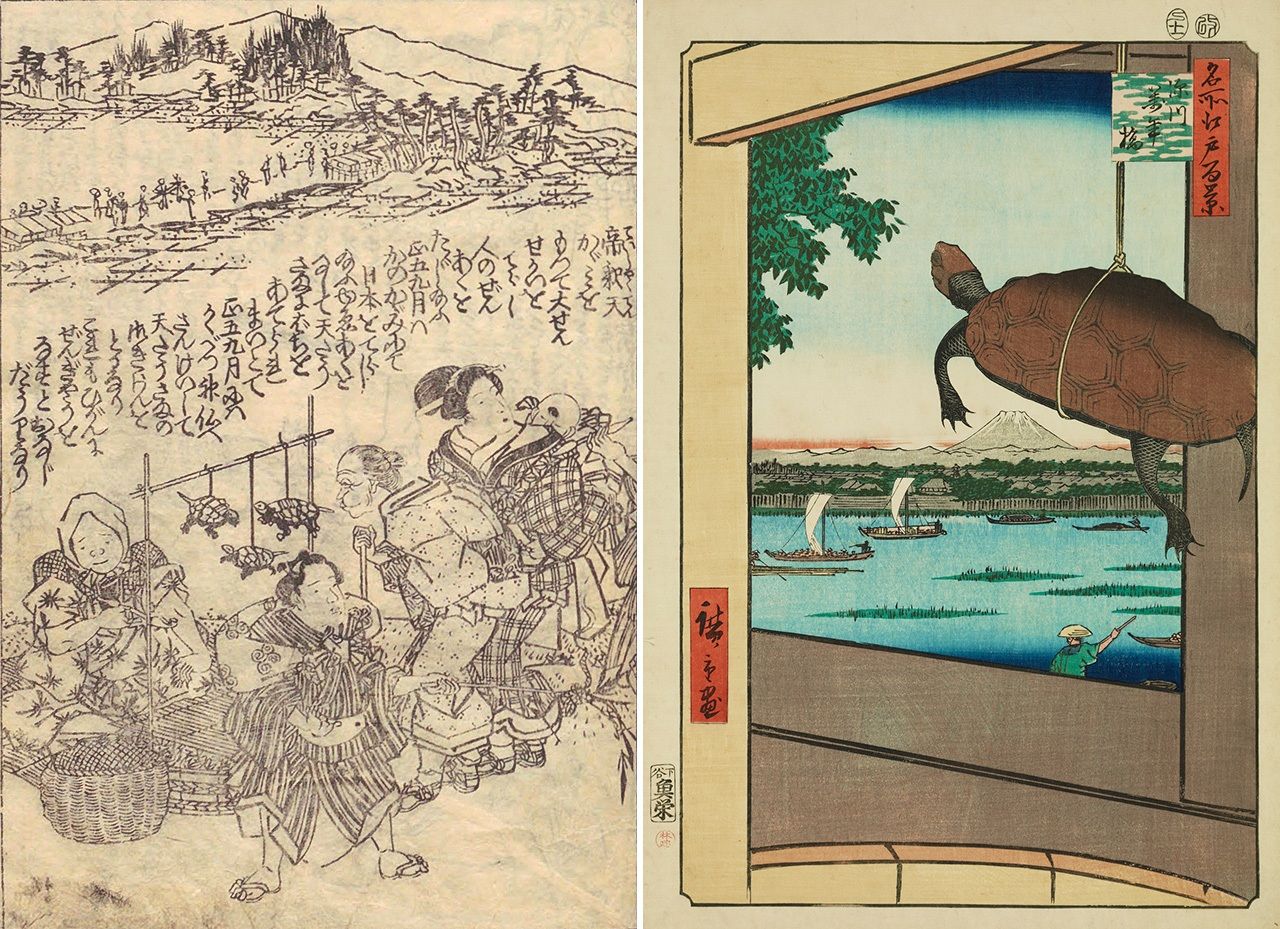 左:路边的商人将乌龟用绳子吊起来售卖(出自《五节供稚童讲释》,国立国会图书馆藏) 右:歌川广重在浮世绘《名所江户百景 深川万年桥》中描绘的被售卖的乌龟特写(图片来源:colbase)