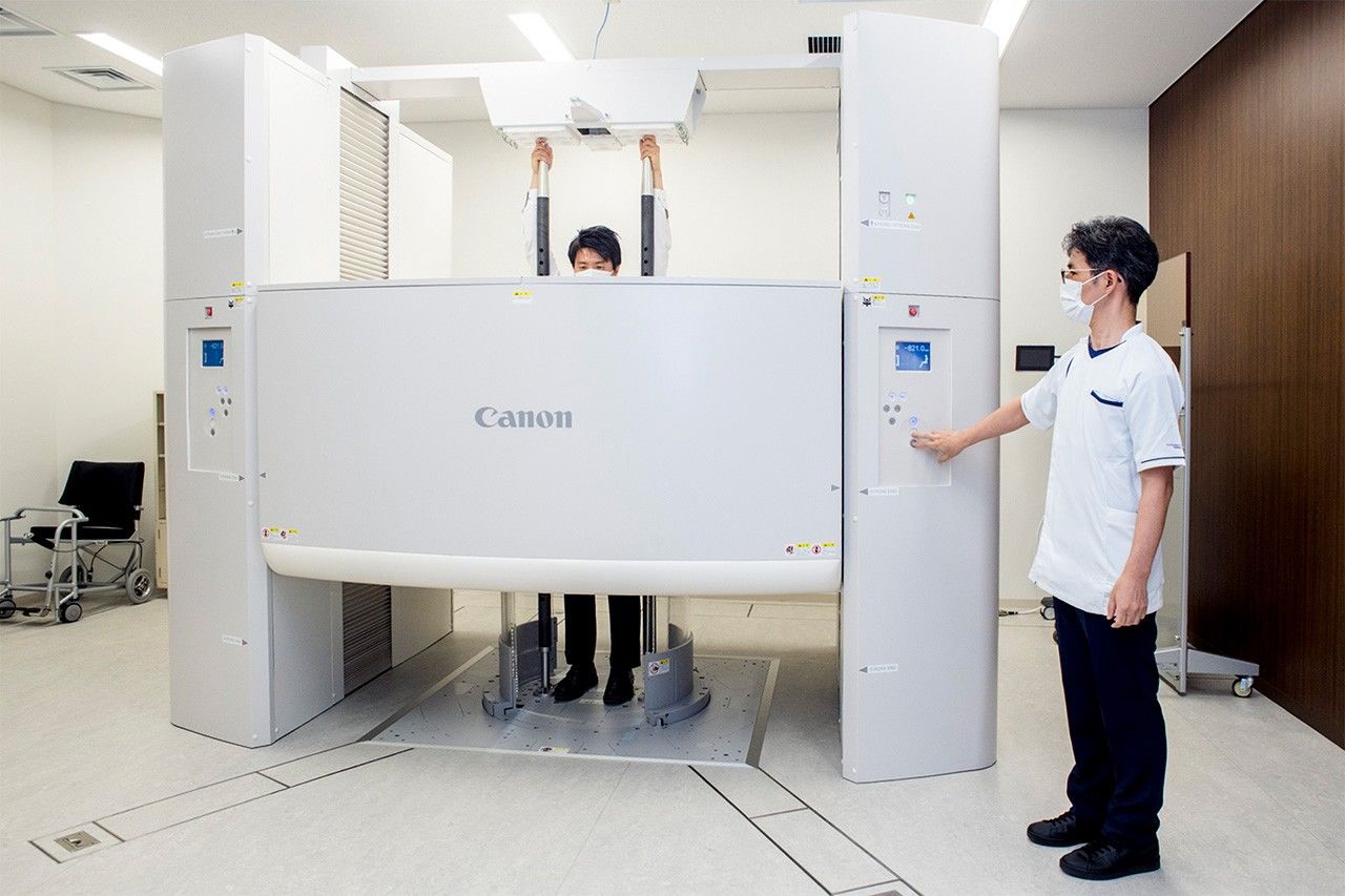 日本国内第三台投入使用的以站姿拍摄断层影像的站立位CT。在接近于日常姿势的状态下拍摄,有望得出更加精准的诊断结果