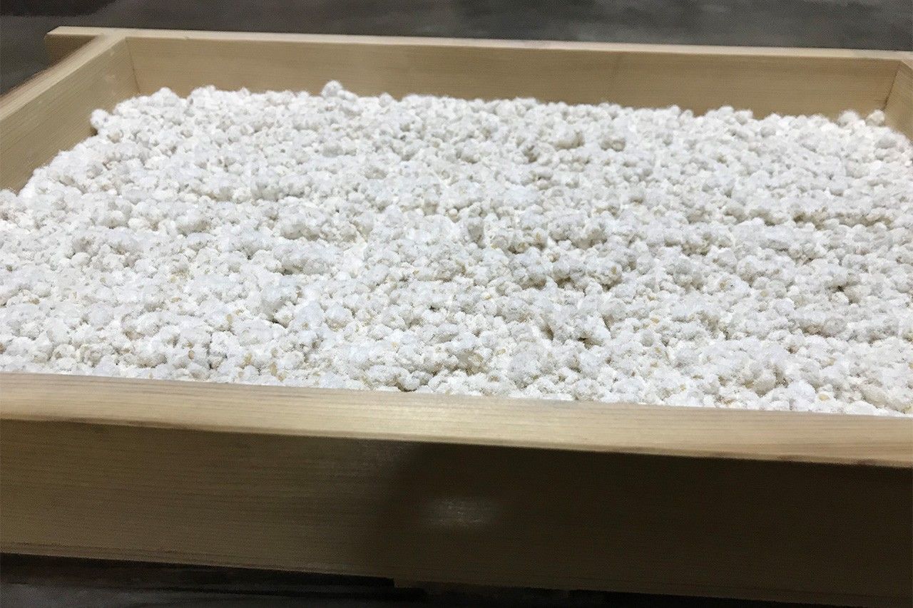在颗粒的状态下,乍一看很难判断这是种曲还是以种曲为基础制作的成品酒曲。菱六对种曲的管理控制在孢子的发芽率为95%以上,真正堪称“酒曲的种菌”。在将种曲散布到原料上后,只需48小时便可制成酒曲,培养时间为种曲的一半以下。如果把种曲比作父母,可以说酒曲就如同他们的孩子吧。