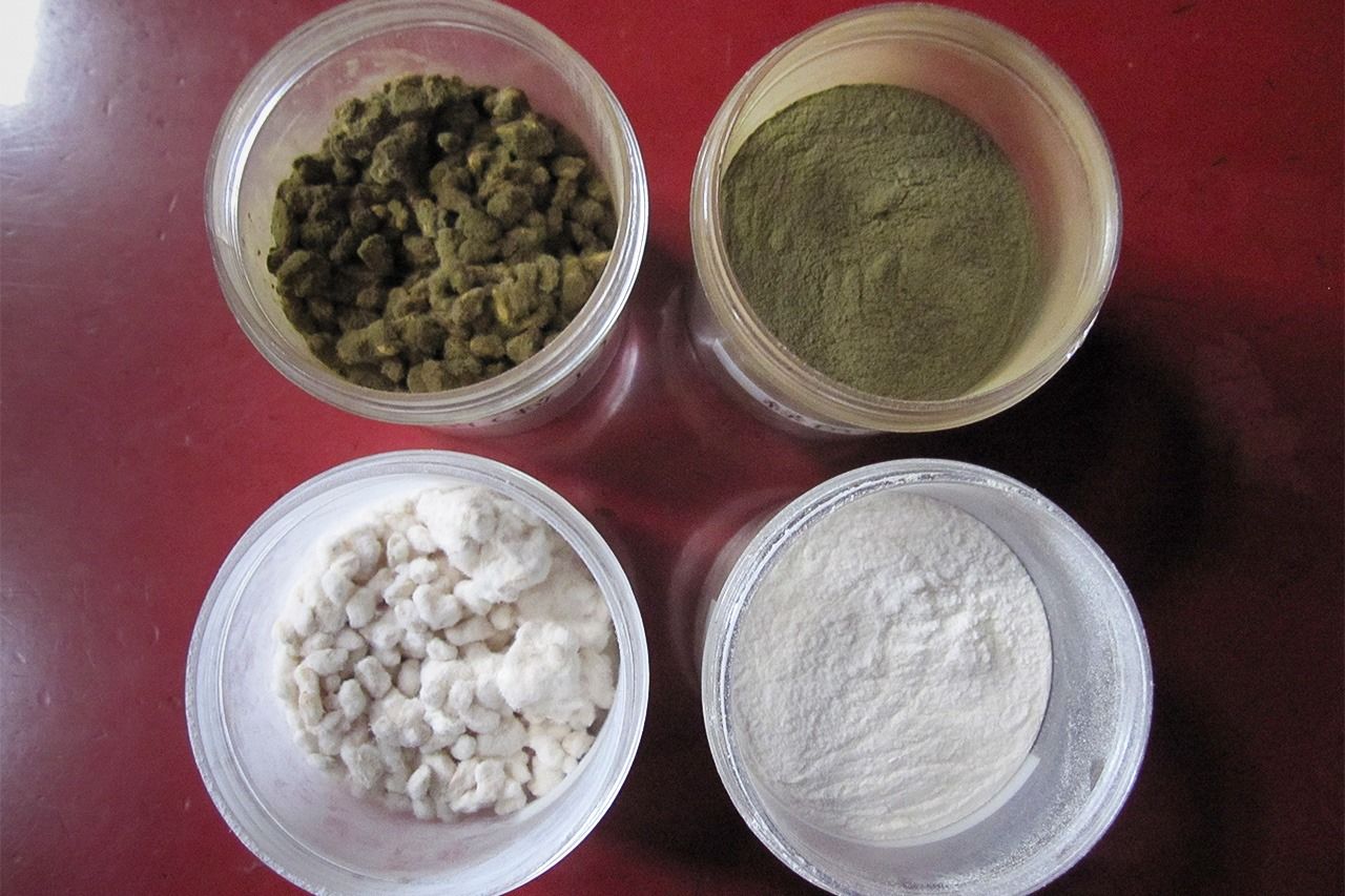 绿色系和白色系的种曲。左边为颗粒状,右边为粉末状(图片:助野彰彦)