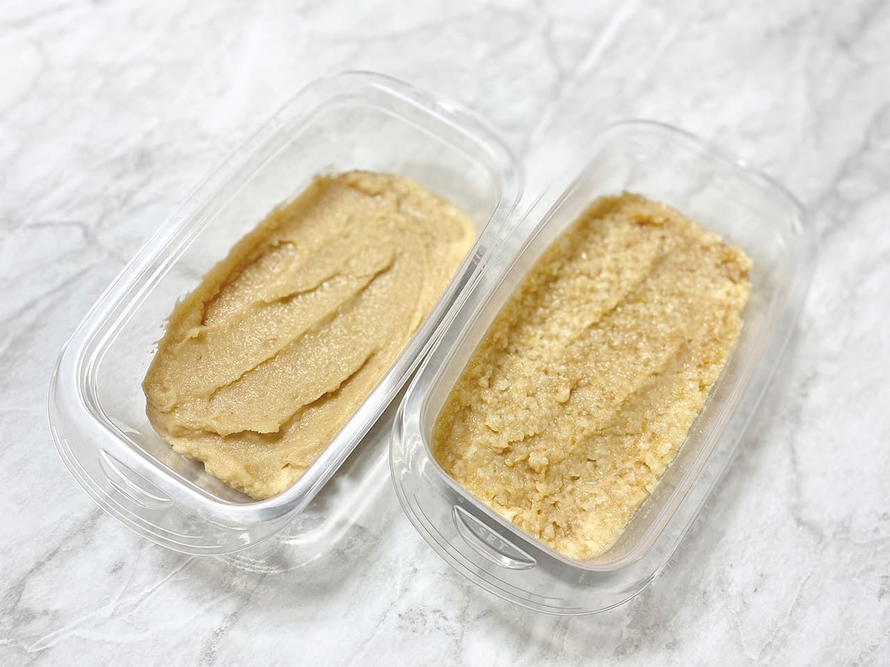 用电饭煲制作的白味噌(右)。如果不喜欢这种颗粒感,可以用破壁机处理,就能和商场里卖的味噌(左)一样细腻