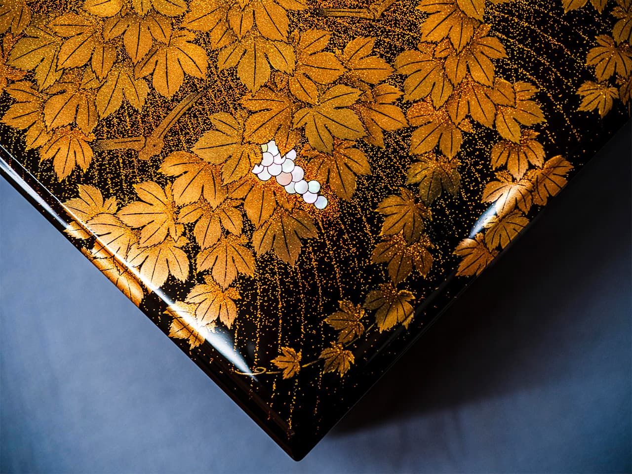制作《天惠》时,创作者先用漆描绘叶子和阳光的图案,再使用“粉筒”,以指弹的方式撒上金粉。之后再上一层漆,待漆面干透后,用木炭研磨出纹样。葡萄与松鼠的形状则采用“螺钿”技法,将贝壳切割成纹样的形状贴于表面,再用木炭打磨完成。
