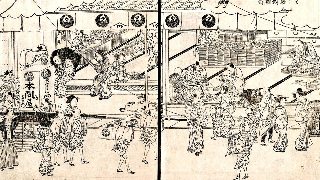 图中描绘了1779年鳞形屋店铺的景象(出自《三升增鳞祖》,日本国立国会图书馆藏)