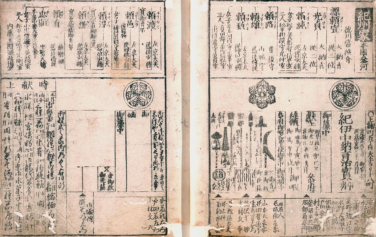 大名名录《武鉴》的一部分。此为宽政年间书物问屋“须原屋茂兵卫”发行的版本,收录了纪州德川家的家谱、家纹(日本国立国会图书馆藏)