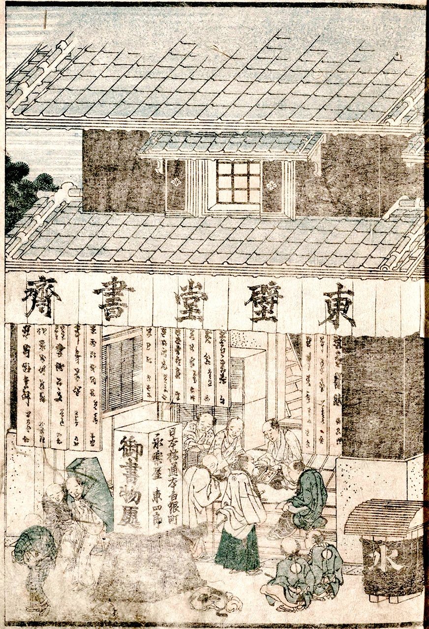 葛饰北斋在作品《道中画谱》中描绘的版元“东壁堂”。东壁堂于1776年在名古屋成立,店铺外观与江户的版元无异,还曾与江户的版元联合出版过书籍(日本国立国会图书馆藏)