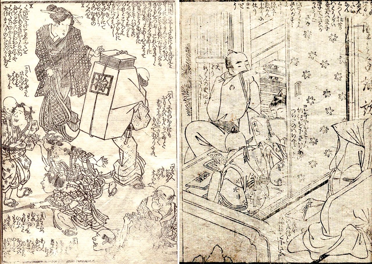 (左)《倾城怪谈冬乃月》描绘了一名走街串巷的借书商背影。(右)《从夫以来记》描绘了借书商拜访大名府邸的场景。武士的子女们正在选书,其后是他们的父亲(日本国立国会图书馆藏)