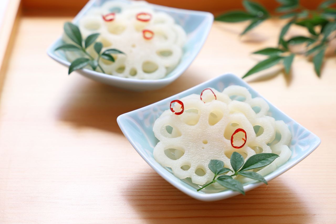 这是一道日式家常腌菜,将切成薄片的莲藕焯水后泡入糖醋中制作而成。醋腌藕清爽开胃,若将藕片边缘切一圈V型凹槽,就能营造出如同在餐桌上装饰了鲜花般的效果,更加富有情趣。