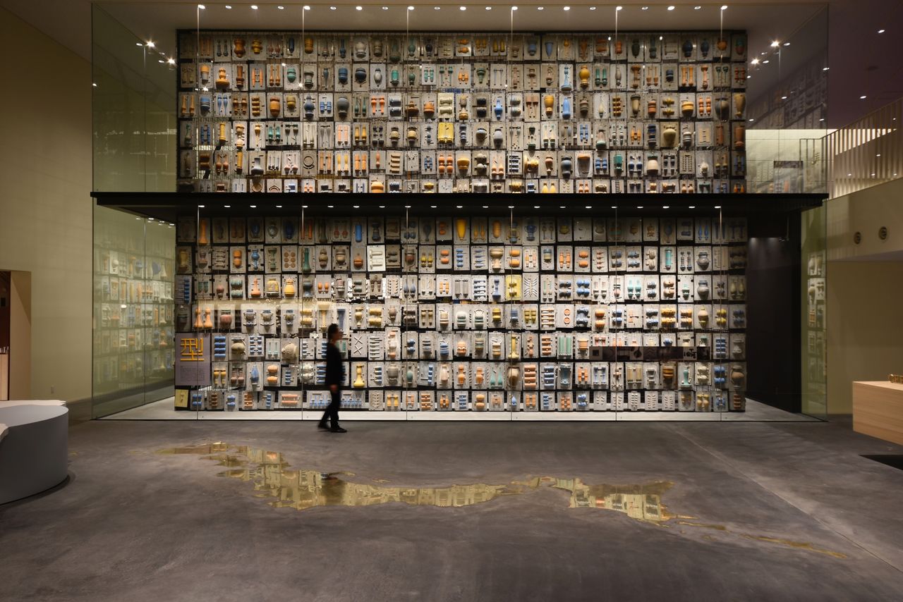 能作长年制造产品使用的木质铸模被做成展示墙,这里成为网红打卡点。前方地面是光亮如镜的黄铜质地的日本地图,体现了工匠的高超技艺(图片:Koizumi Studio)
