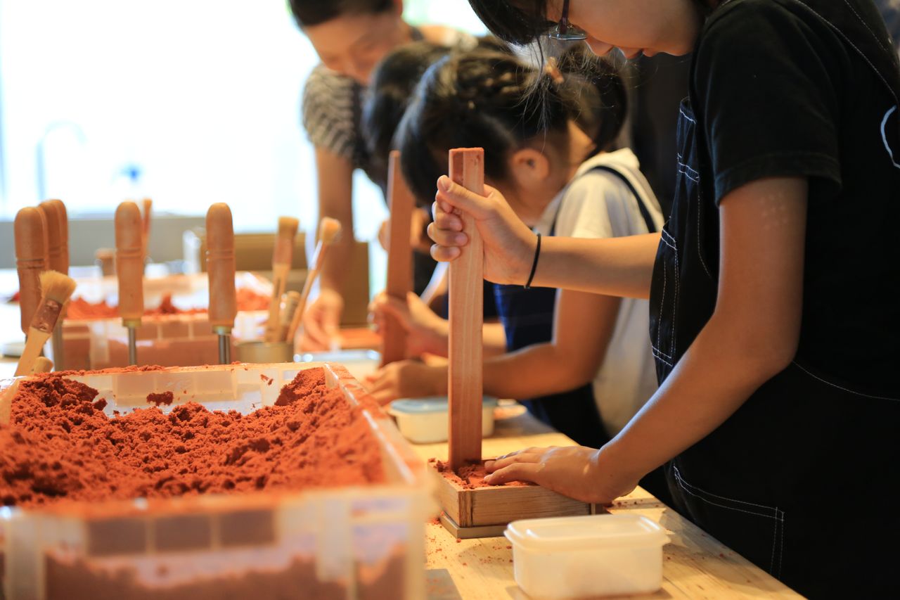 在体验工坊,参观者将砂压实后定型,创作属于自己的锡制品,小朋友也可以参与