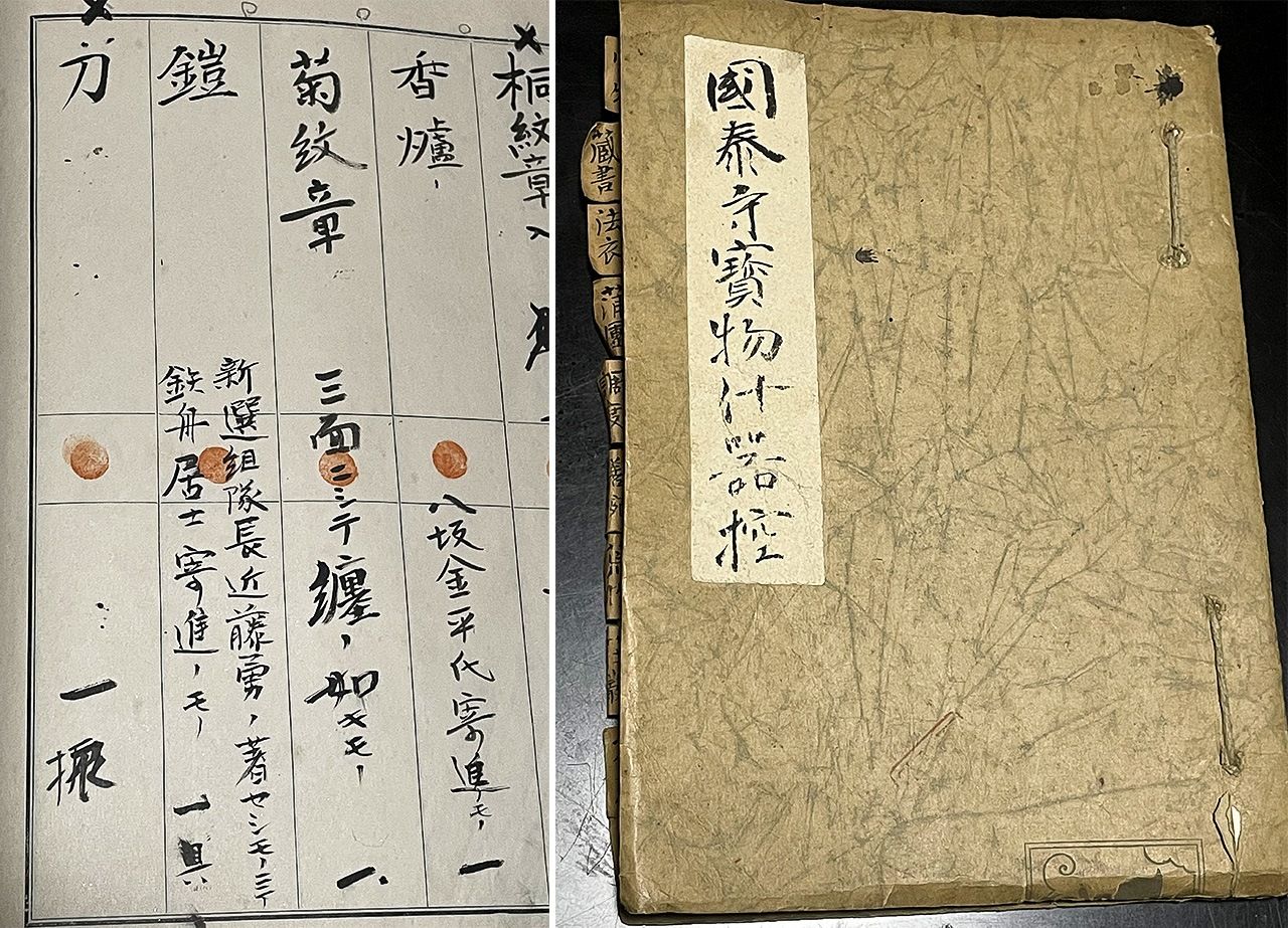 国泰寺的《宝物什器控》(右)。记录了山冈铁舟捐献了一套近藤勇穿戴过的盔甲的事(图片:作者拍摄)