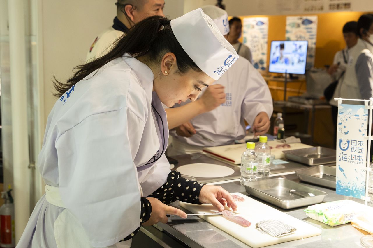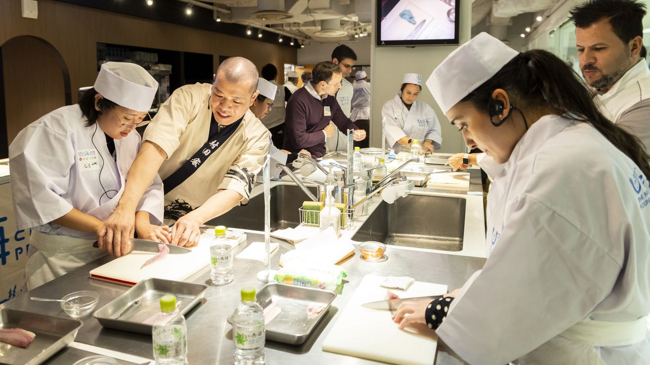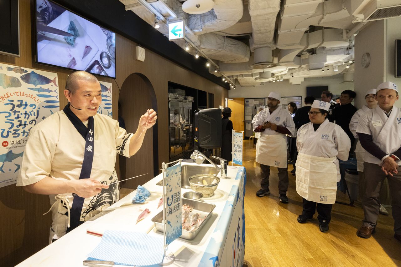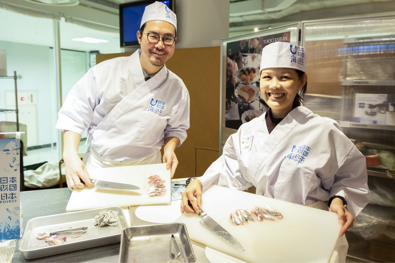 一群旅居日本的外国人身穿短袖号衣,系着围裙,扮成寿司师傅的模样,他们手握厨刀,一脸严肃地把竹荚鱼切成“三枚切(*1)”。这是去年11月29日在东京某烹饪教室举办的一场名为“Sabakeru:Sustainable Seafood Culture from the Japanese Kitchen”的活动,目的是让外国友人通过体验庖丁解“鱼”,了解日本的食鱼文化和各种海洋问题。
