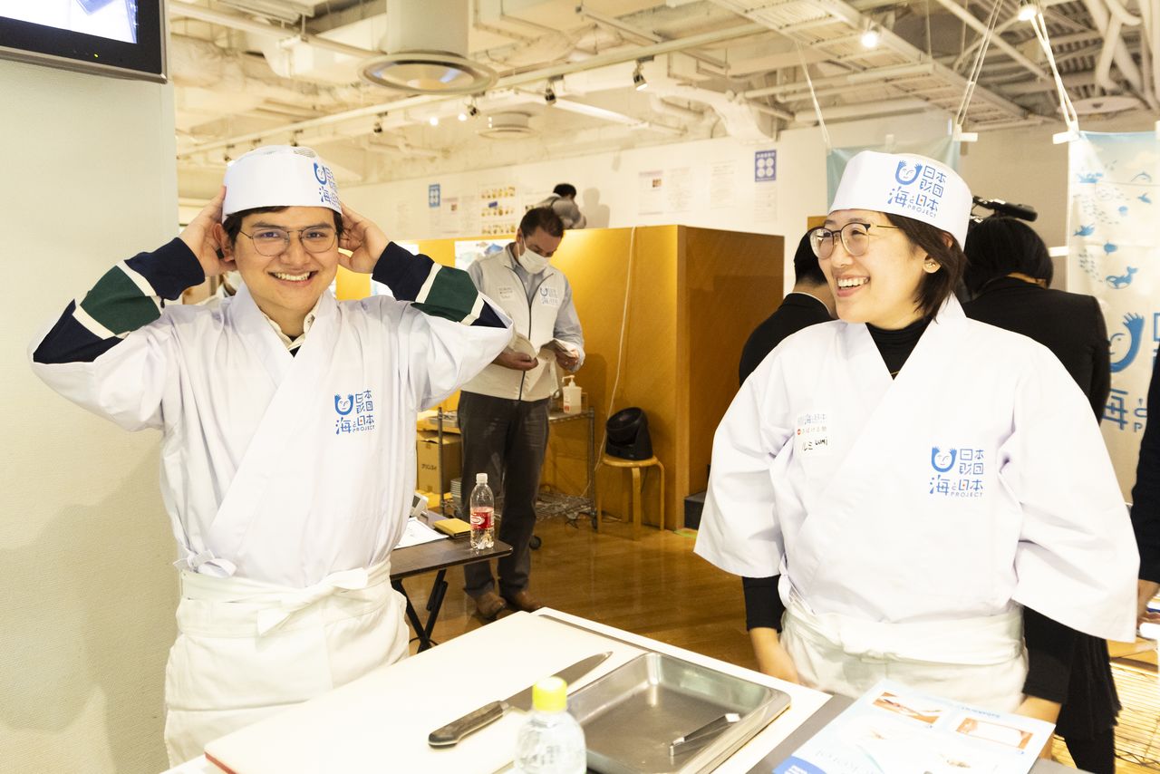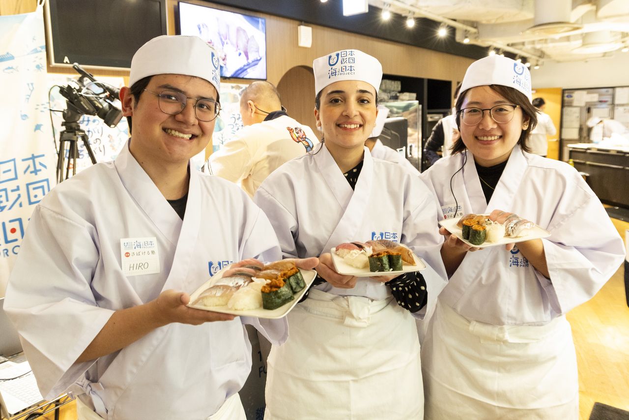 虽说是一场讲座,但现场始终洋溢着欢乐的气氛,毫无拘束之感。首先,让外国友人们品尝一点寿司食材,让他们猜猜是什么鱼。“虽然吃起来味道很像金枪鱼或三文鱼,但其实是魔芋”——听到这样出乎意料的答案,现场一片惊呼声。接着,大家又认真倾听了讲师的说明,了解到“这种食品在防止海洋资源枯竭方面发挥着作用”。