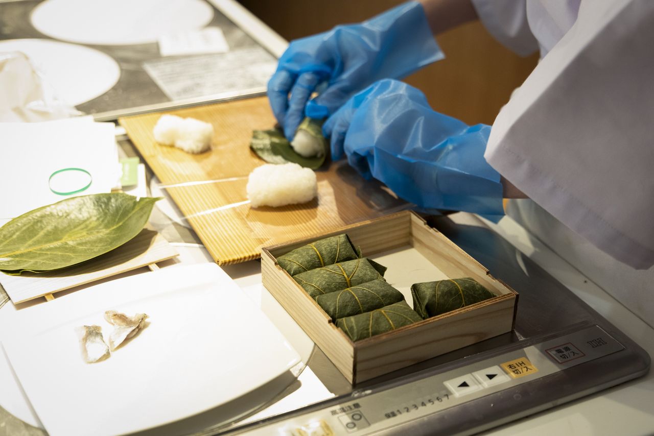 在切好的竹荚鱼上撒一些盐,然后用醋腌一下,就成了比手握寿司历史更悠久的“柿叶寿司”的食材。这个环节是希望外国友人们亲身体验这种被称作“寿司原型”的古都奈良著名美食的制作过程。创立于1861年(文久元年)的老字号“柿叶寿司平宗”(总店位于奈良县吉野町)的社长平井孝典和饭田恭代在本环节为大家提供了指导。