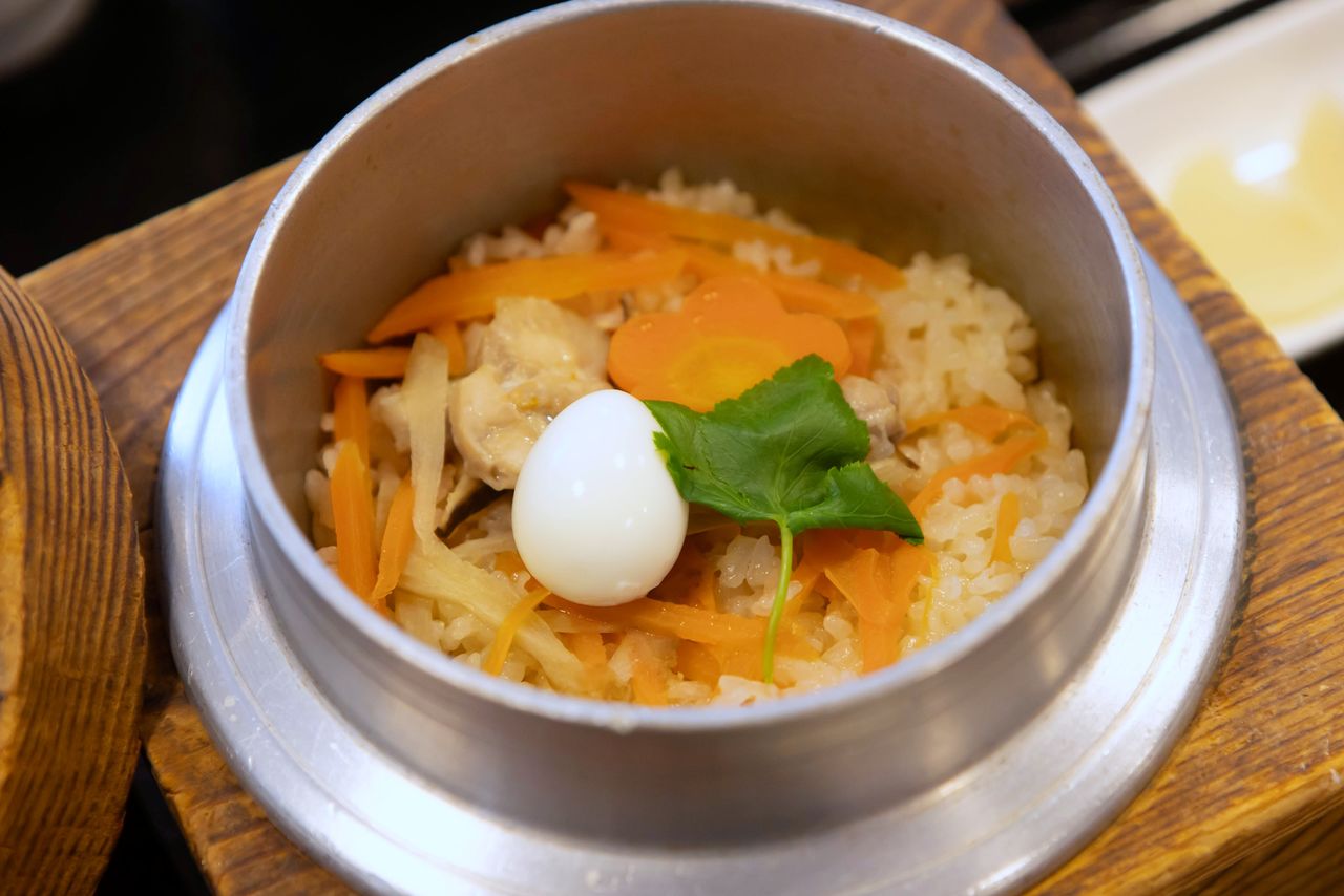 招牌美食“温泉小锅什锦焖饭”,配有味噌汤、小菜、咸菜(图片:Fukusako Ayako)