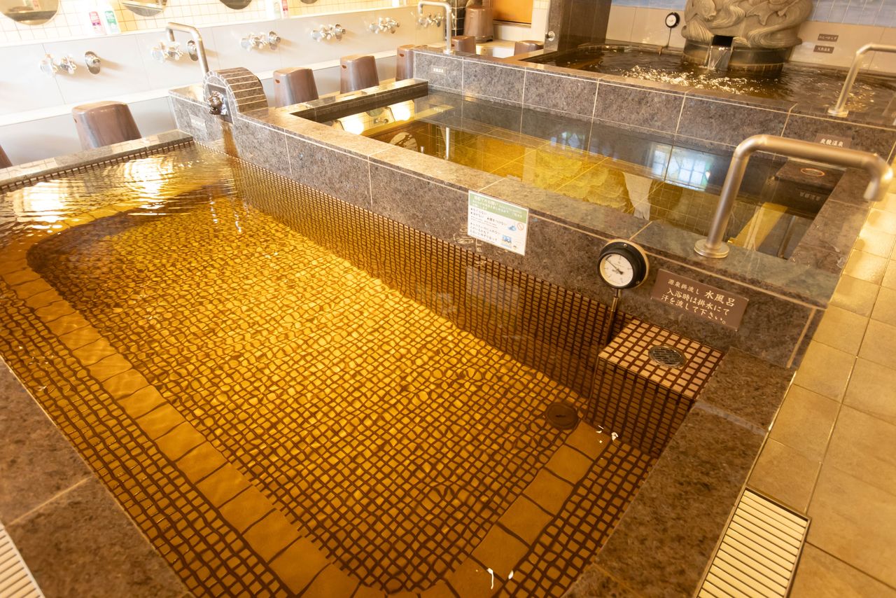 浴池并排设有三个,最里侧是天然温泉浴池。温泉水是漂亮的橄榄色,温度适中。中间的浴池是在温泉水中加入了二氧化碳的“碳酸温泉”。温泉中的碳酸渗入肌肤,对促进血液循环具有良好效果。浸泡在温度适中的温泉中,水面以下的身体会变得微微泛红,此时便能感受到它的效果。