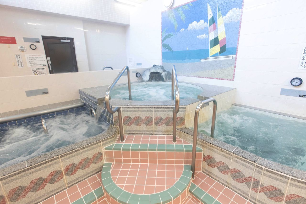从侧面喷出水泡的按摩浴池(中)、从底部出泡的震颤按摩浴池(左)和电极脉冲按摩浴池(右)(图片:Fukusako Ayako)