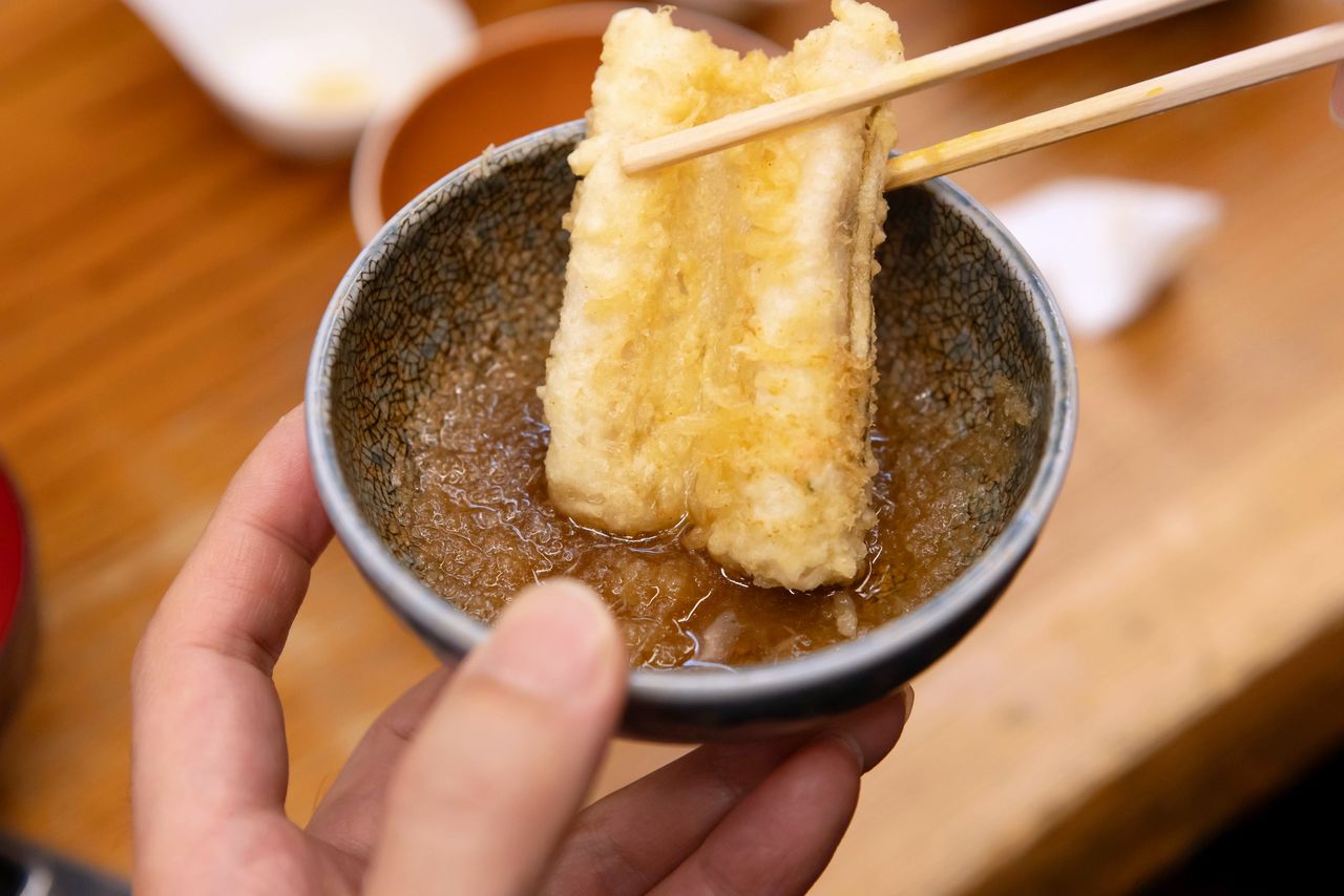 江户前著名特产——海鳗天妇罗。在“天妇罗Suzuki”,午餐均为套餐,晚上则可以根据个人喜好选择单点或其他形式。这家店的天妇罗美味且实惠(图片:Fukusako Ayako)