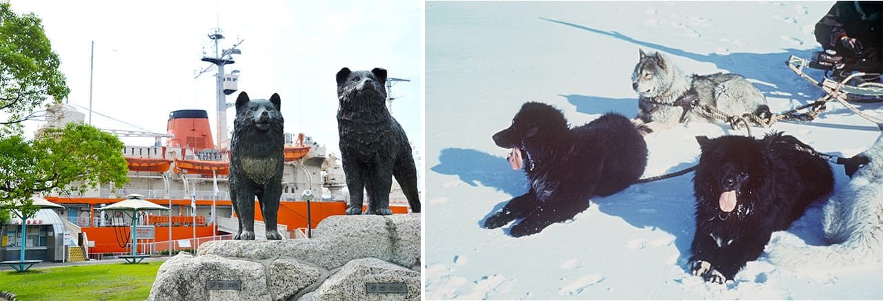 左图:保存在名古屋港的南极观测船“富士号”前也有太郎和次郎的雕像 右图:在南极时的太郎(左)和次郎(右)(图片:时事社)