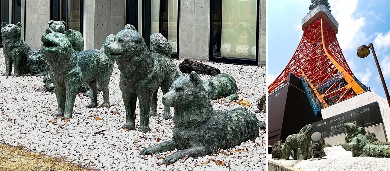 (左图:15只桦太犬的青铜像,由安藤士制作。安藤同时也是东京涩谷站前忠犬八公像的制作者(图片:天野久树) 右图:曾被设置在东京塔入口处的桦太犬像(图片:时事社)