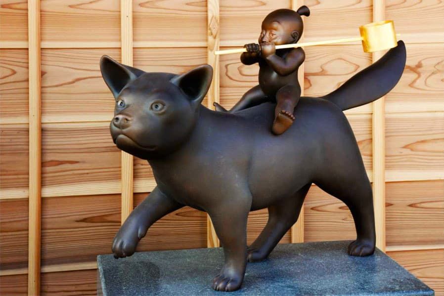 这是一座名为“柄杓童子”的铜像。一名儿童骑在一只狗身上,双手拿着一柄水勺置于背后。底座上刻有这座雕像的制作者、雕刻家籔内佐斗司撰写的碑文。