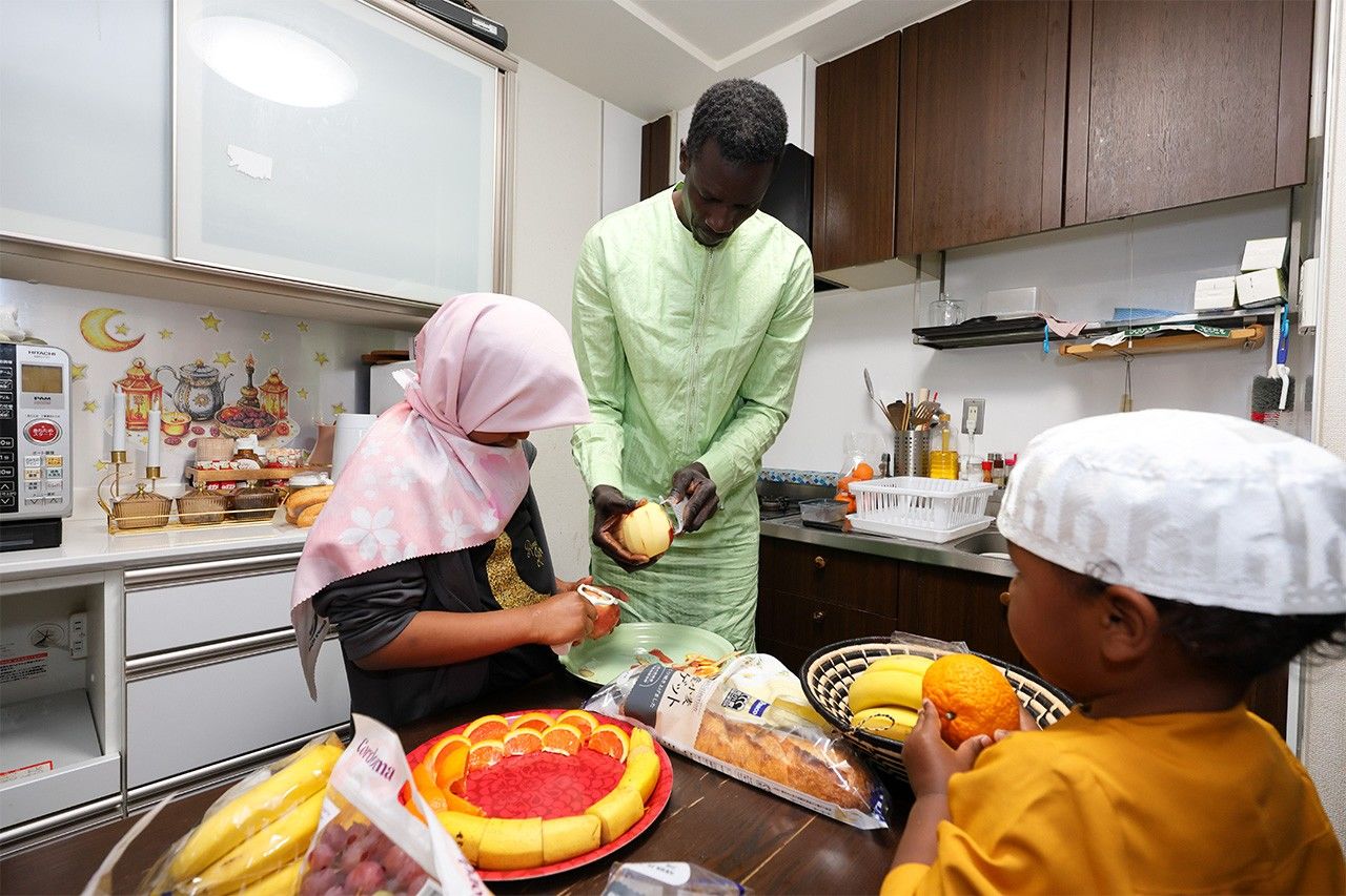 傍晚时分,大女儿从学校回家。明日香去保育园接弟弟妹妹。当乌塞努开始准备开斋饭时,孩子们便聚到厨房里来。