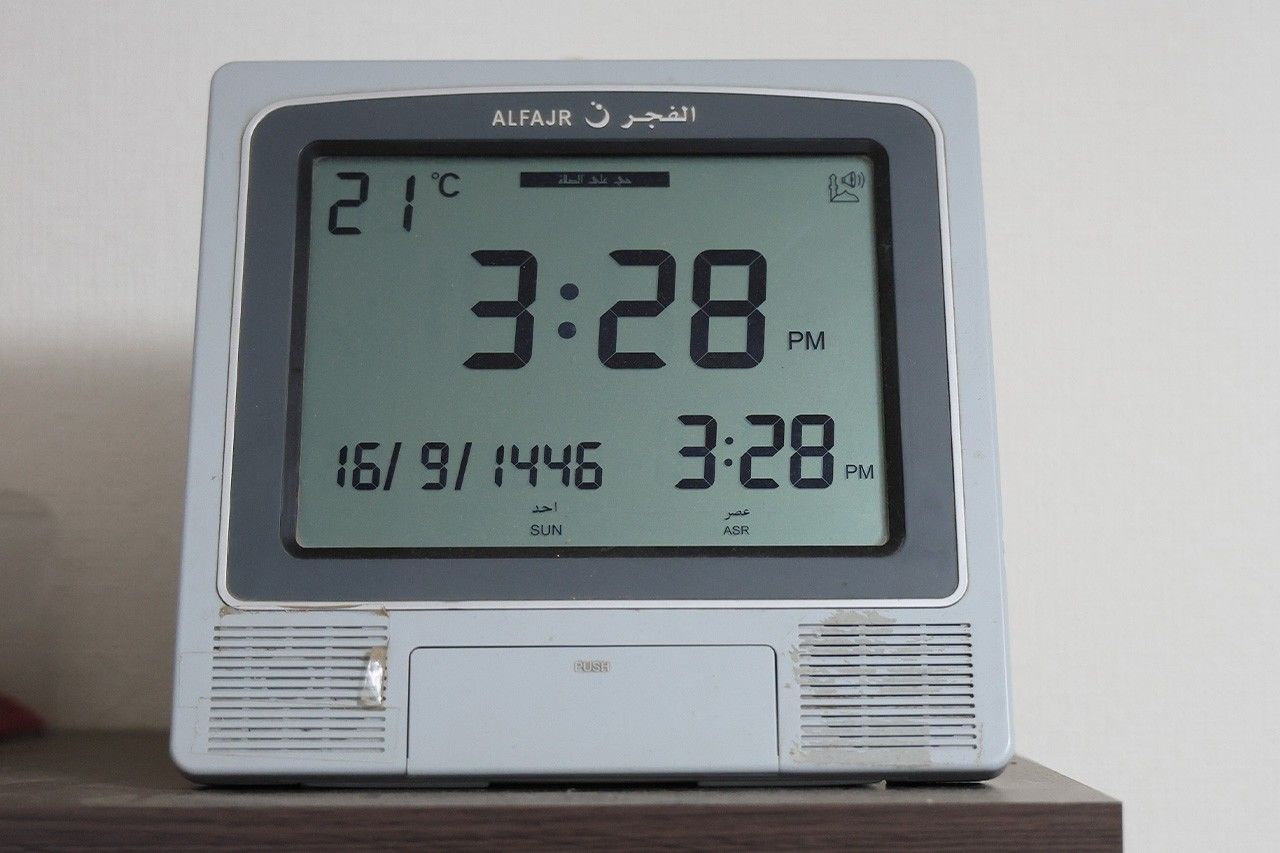东京近郊某栋公寓的一个房间。正在采访时,不知从何处传来一阵清朗而庄重的歌声。我不由得环顾四周,问道:“这是什么声音?”对方回答:“是阿赞钟(AZAN CLOCK)的声音。AZAN是召唤祈祷的意思。每到规定的时间,就会响起提醒声。”我抬头望去,发现了摆放在架子一角的电子时钟。乍看它与普通时钟并无二致,但仔细一瞧,日期显示的是1446年9月。这不是公历,而是伊斯兰历。
