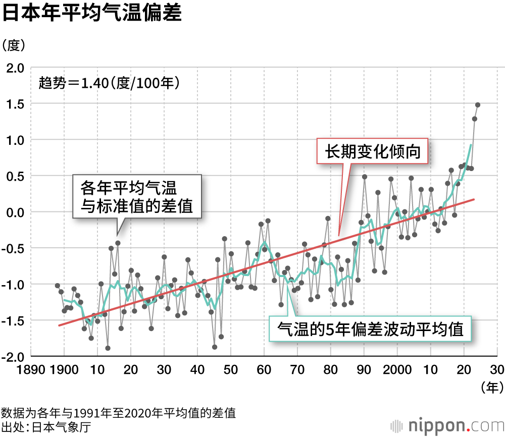 尤其是夏季气温逐年升高,最高气温超过35度的日子越来越多。个中原因之一,在于夏季太平洋高气压势力不断增强。特别是太平洋西部菲律宾周边海域的海水温度一旦上升,日本附近的高气压就会增强,容易出现连日晴朗的天气。如此一来,不仅是夏季,秋季也会持续高温;冬季即使出现短时间的寒潮天气,但总体上气温也处于上升趋势。