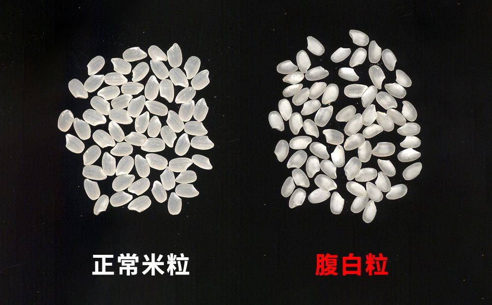 未受影响的正常米粒(左)和高温导致淀粉蓄积不足,颜色发白浑浊的米粒(图片:农研机构)