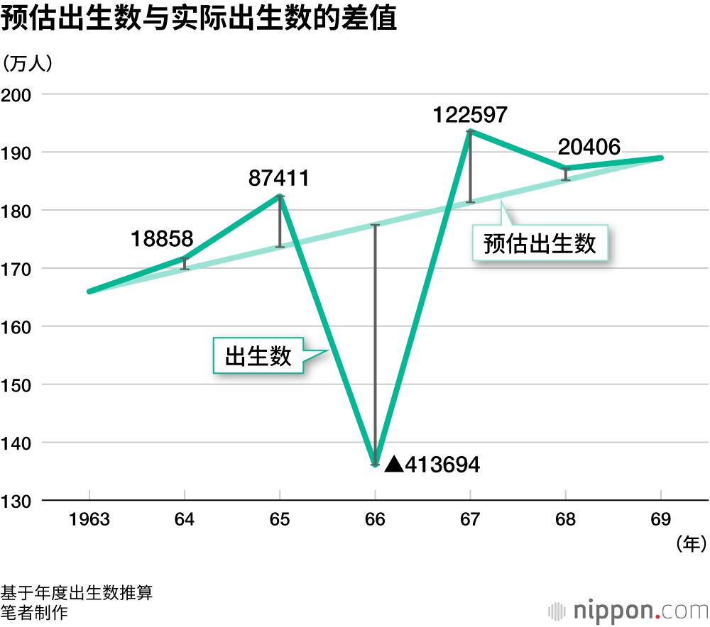 即便如此,仍解释不了为何1966年出现史上最大规模的新生儿减少现象。因为即便在180年前江户末期的赤马年1846年和120年前明治时代的赤马年1906年,新生儿数量也没有出现如此剧烈的波动,而那时的人们显然比现在更加迷信,更在意福祸吉凶。