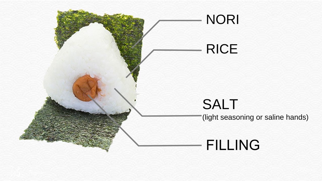 传统的饭团馅料包括梅干、烤鲑鱼、盐渍昆布、鲣鱼片、佃煮(煮小菜)等。这些食材的共同特点是保存性高且与米饭搭配效果佳。沿海地区主要使用鱼贝类、海藻等,而内陆和山区则多使用山菜、味噌、腌渍物等。