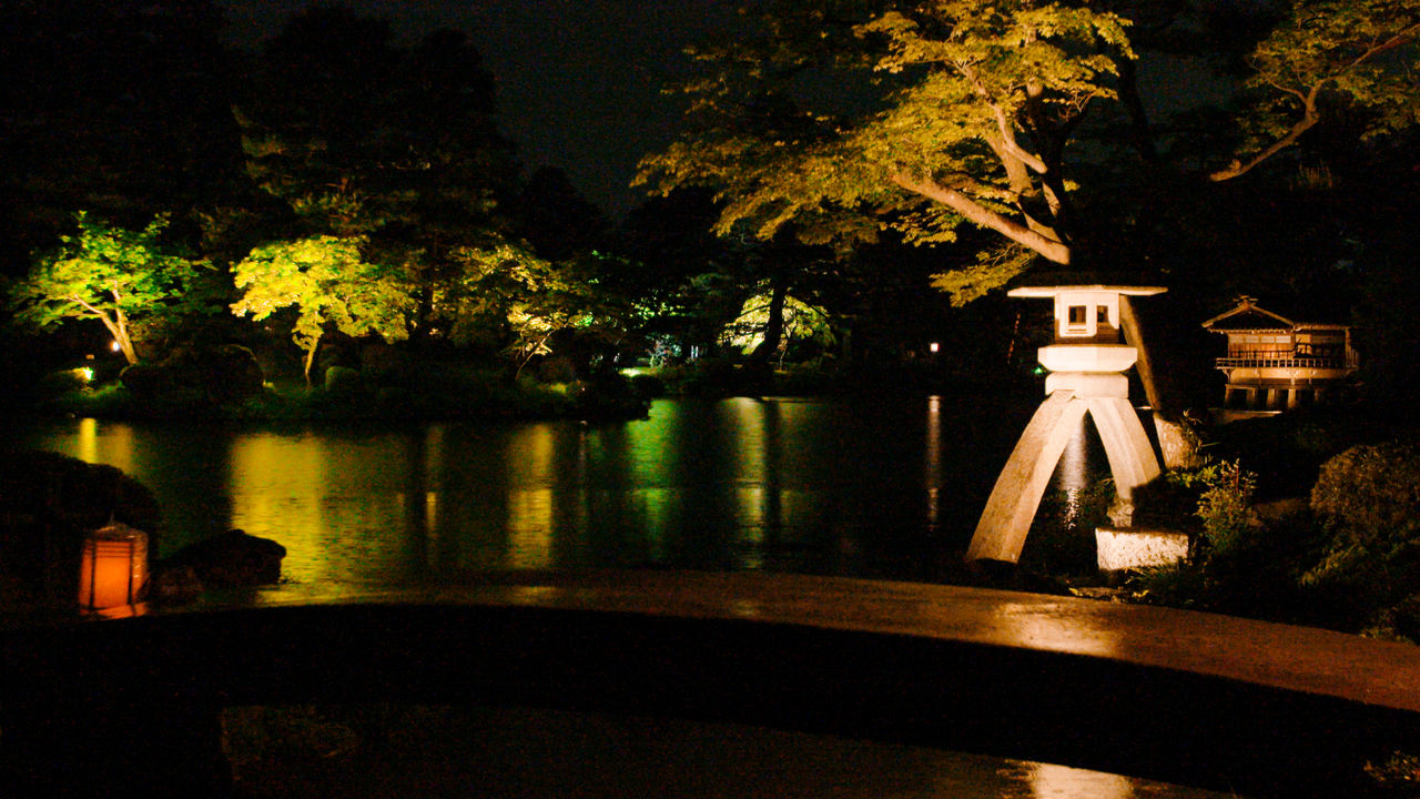 它们都是家喻户晓的金泽观光名胜。在四季的不同节点都会举办灯光秀活动,期间游客可以观赏园内的夜景。在梦幻般的灯光点缀下,金泽城的三御门、兼六园的徽轸灯笼(因形似琴腹下转动琴弦的轴“徽轸”而得名——译注) 、蜿蜒的小河流水和珍贵的树木美轮美奂,让人流连忘返。