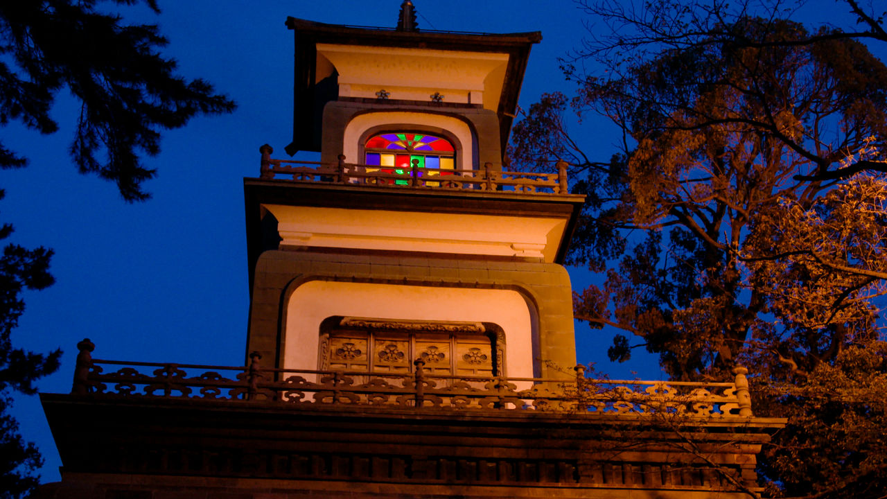 尾山神社供奉着加贺藩创建人前田利家及其正室阿松。神社的标志性建筑“神门”建于明治8年(1875年),现已成为国家重要文化遗产。神门的三层镶嵌着彩色玻璃,是日西合璧的建筑风格,在夜晚的灯光映衬下显得格外美丽。