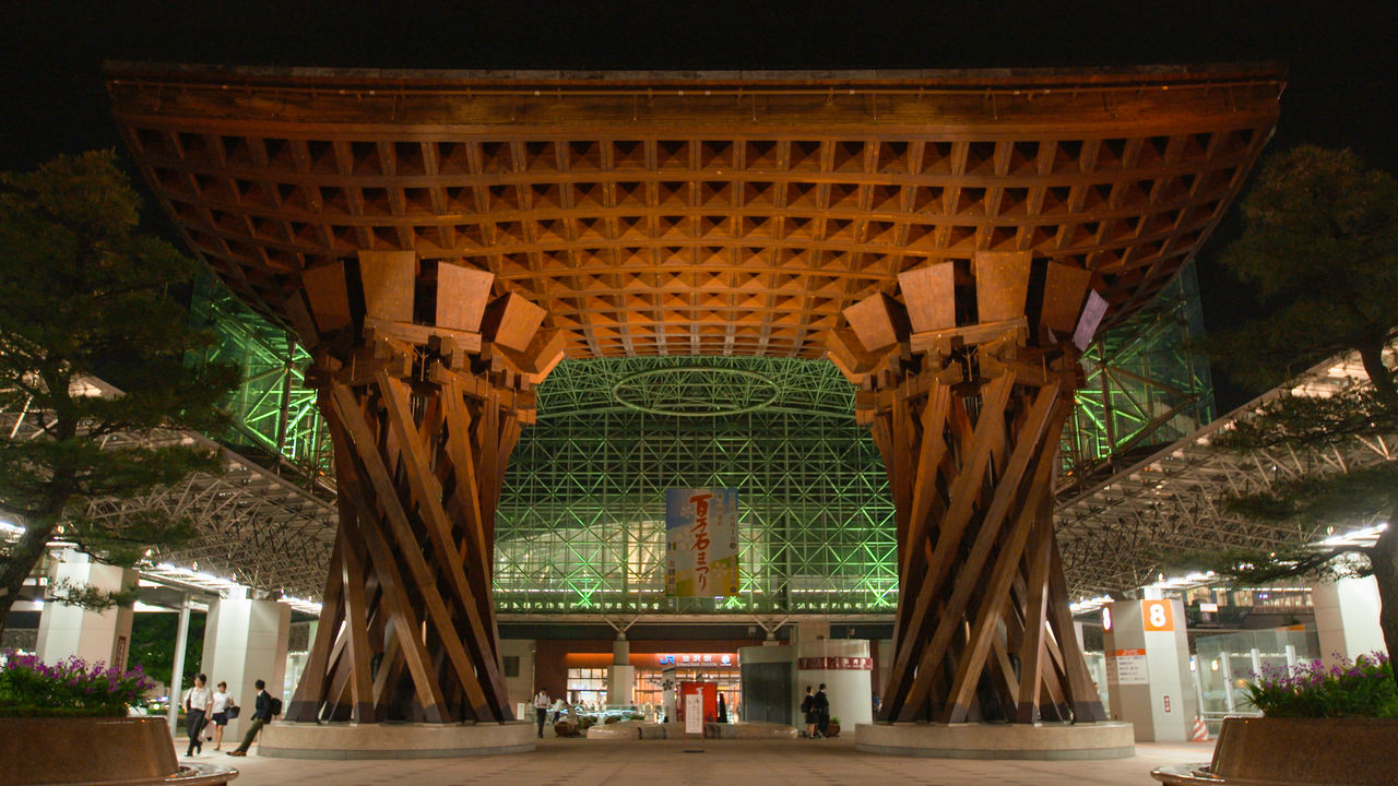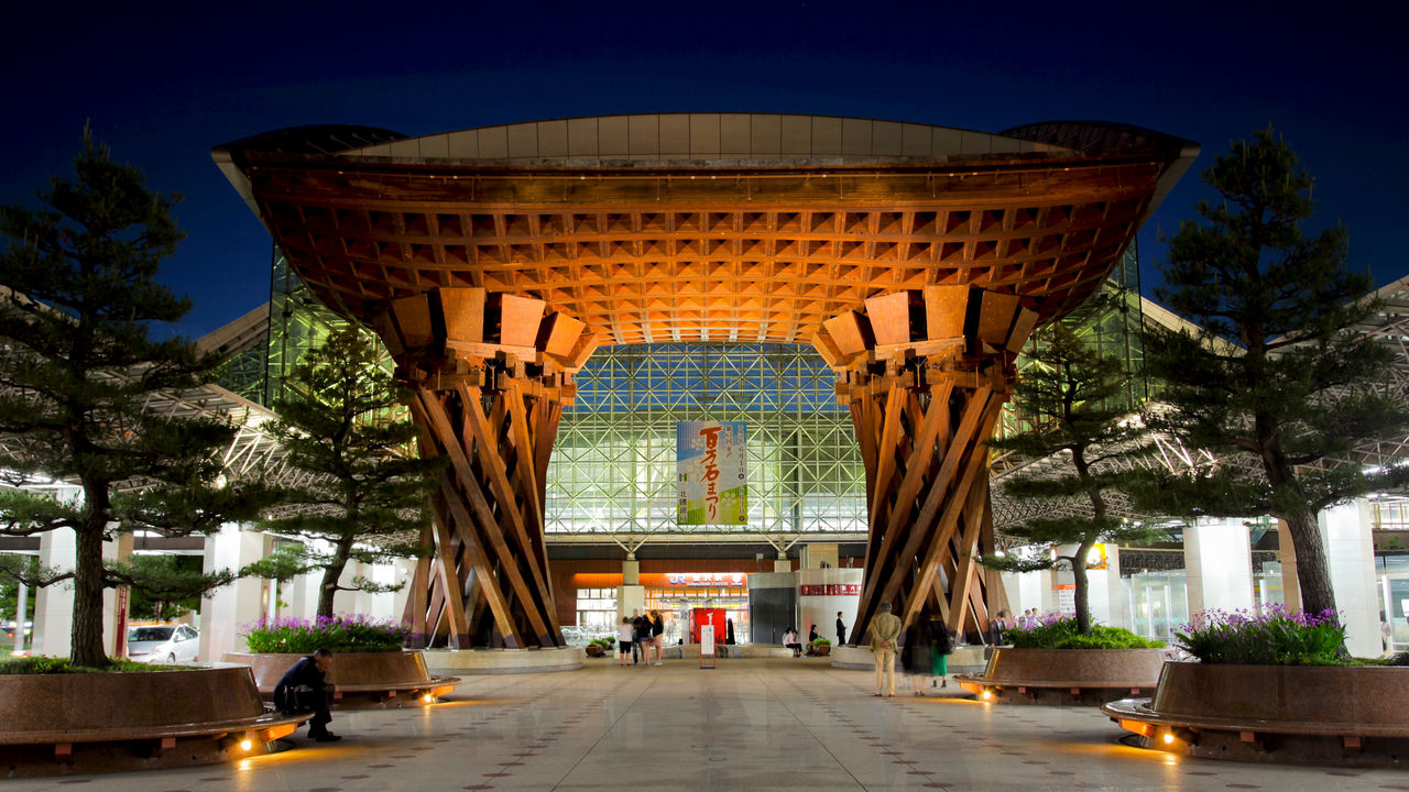 伴随北陆新干线通车,金泽站焕然一新。2011年,美国旅游杂志《漫旅Travel+Leisure》网络版将它评选为“世界最美车站”之一。金泽站的标志性建筑是位于正门的“鼓门”,其灵感来自金泽盛行一时的传统表演艺术“能乐”中使用的鼓。日落后,在灯光的照耀下,鼓门显得更加雄伟壮观,引人入胜。