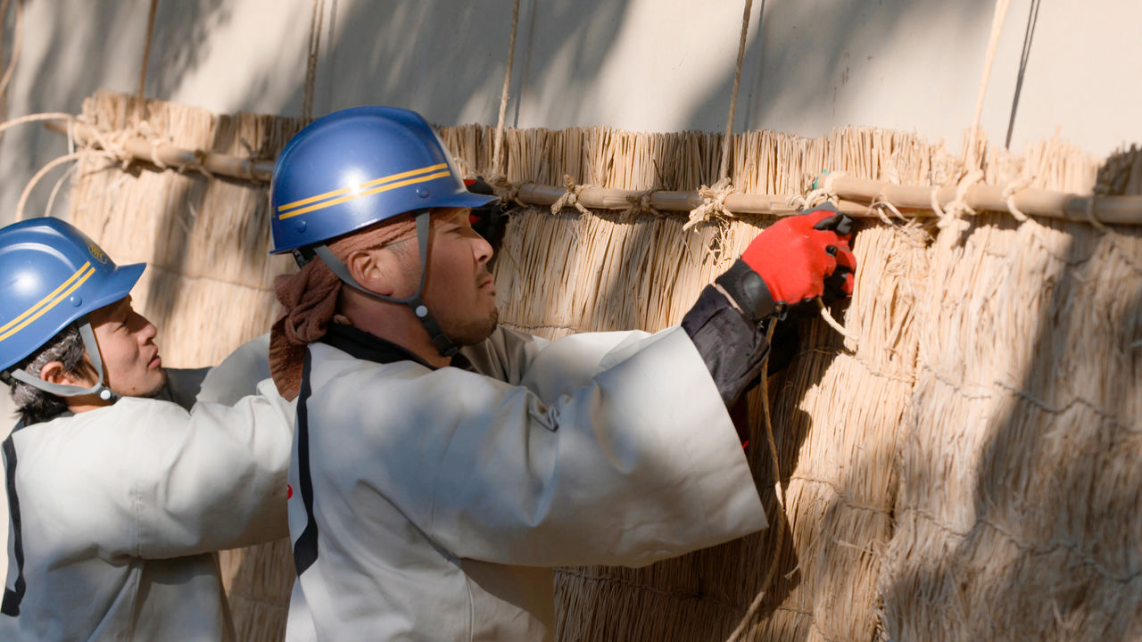 在长町武士宅邸遗址,为了保护土墙免遭大雪的侵害,人们要进行“挂草席”作业。这种草席,是用稻草编织而成的。它的作用是防止渗入土墙的水分冻结后让墙体产生裂纹,并防止土与附着的雪一起剥落下来。这项作业通常在每年12月进行,大约需要三天时间,之后要一直保留到不再有降雪的早春时节。