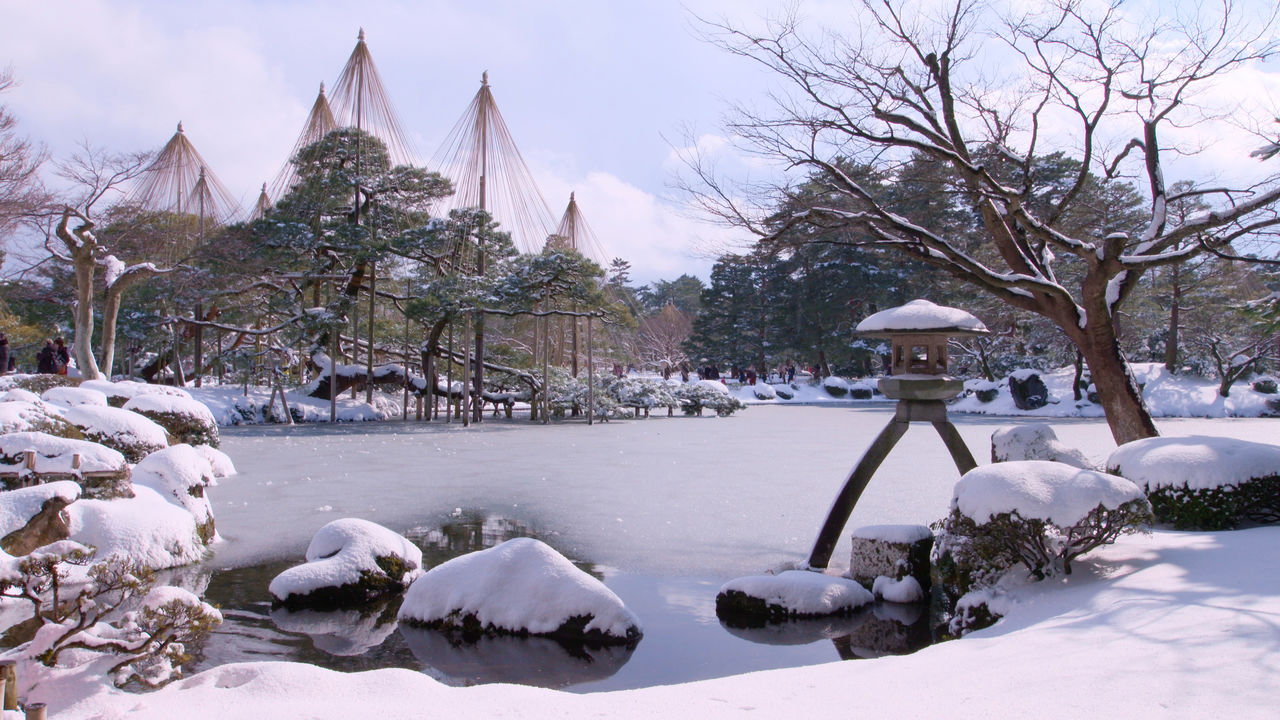 11月,当树木开始变得色彩斑斓时,金泽的大街小巷就开始了过冬的准备。在日本三大名园之一的兼六园,为了避免湿重的大雪压垮树木枝干,人们采用了一种称作“雪吊”的保护方式,用绳子将树枝固定起来。而由此形成的美丽的几何图案,成为了冬天的著名景观。
